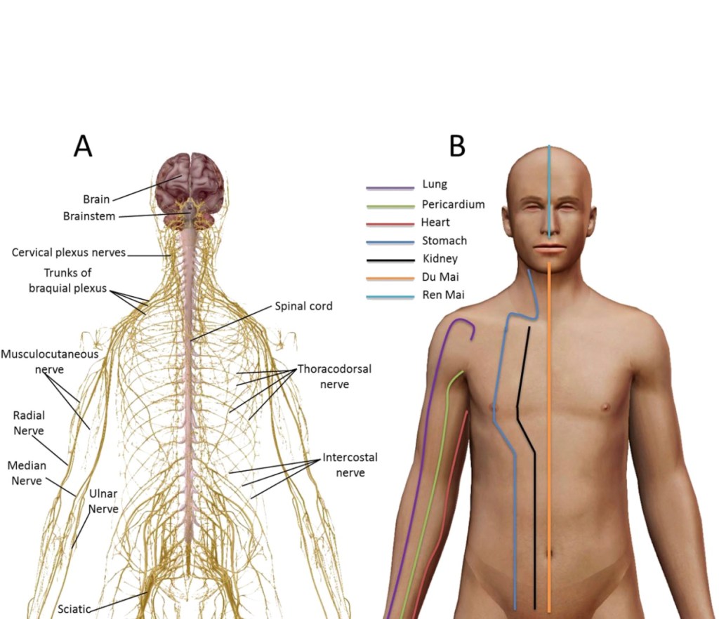 Chi, yine bu geleneksel anlayışa gore, meridyenler denilen ve modern tıpta bir karşılığı olmayan enerji yollarından, kanallardan akar. Meridyenler üzerindeki akupunktur noktaları adı verilen alanlardan özel iğneler batırma, elektrik akımı ya da laser uygulama gibi yöntemlerle uyarılar verilerek bozuklukların tedavi edildiği düşünülür. Tarihte Eski Mısır’da, Hipokrat’ın kayıtlarında, Anadolu tıbbında vücuda iğne batırılarak tedaviler yapıldığına dair birçok bulgu vardır.